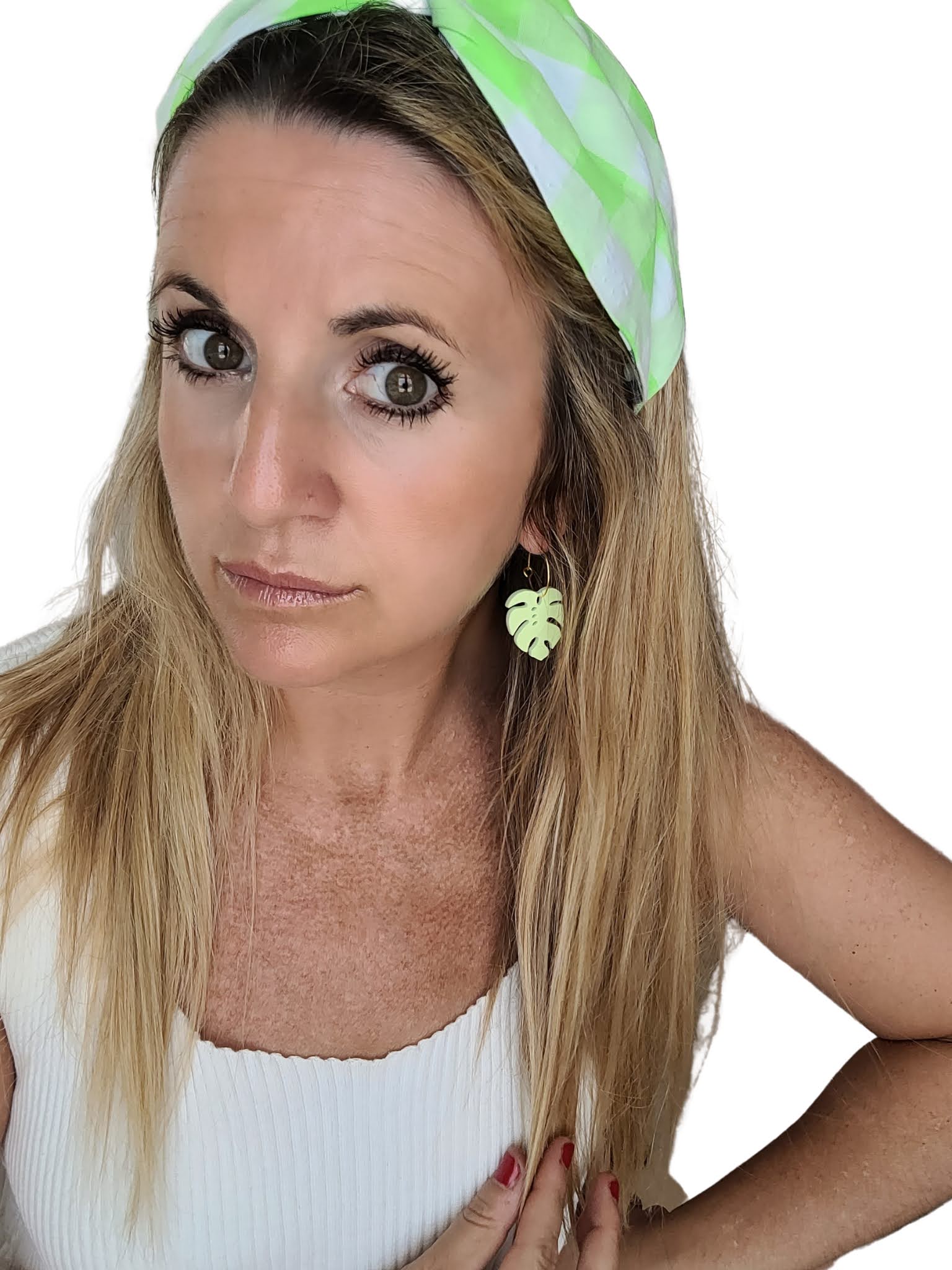 Pendientes con aro de acero inoxidable bañado en oro y hoja de monstera en verde lima.