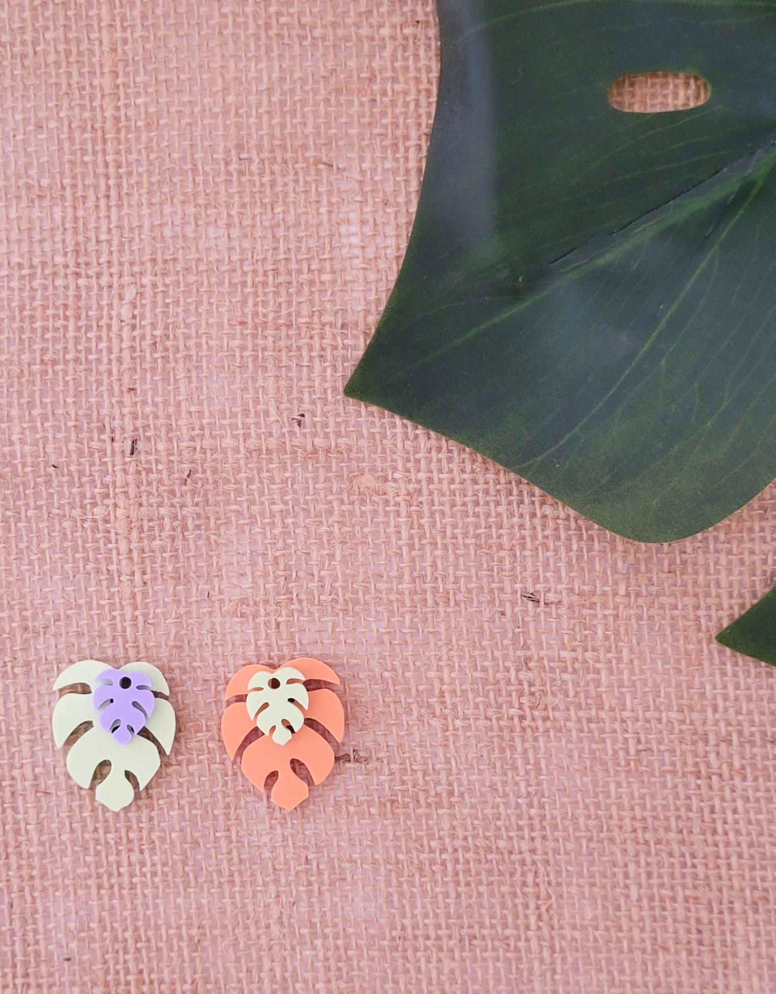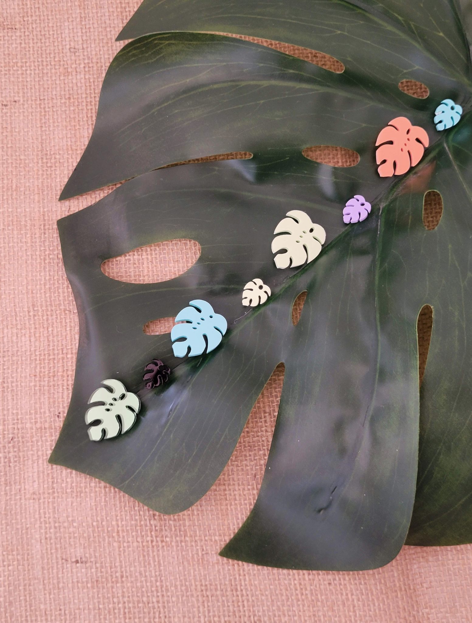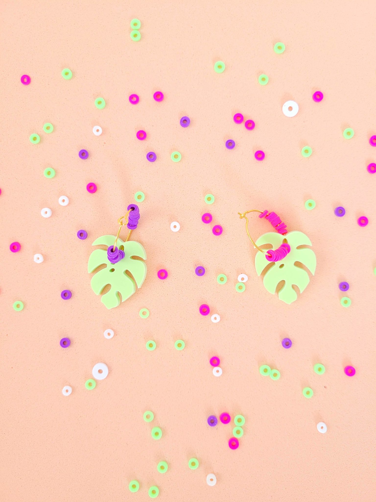 Para dar rienda suelta a tu vena más creativa! Todos vienen con las piezas de los tres colores que ves en la foto, para que acompañes la pieza de hoja de monstera con morado, blanco, rosa o la lleves sólo con el aro bañado en oro! También puedes mezclarlas todas y llevar colorines…