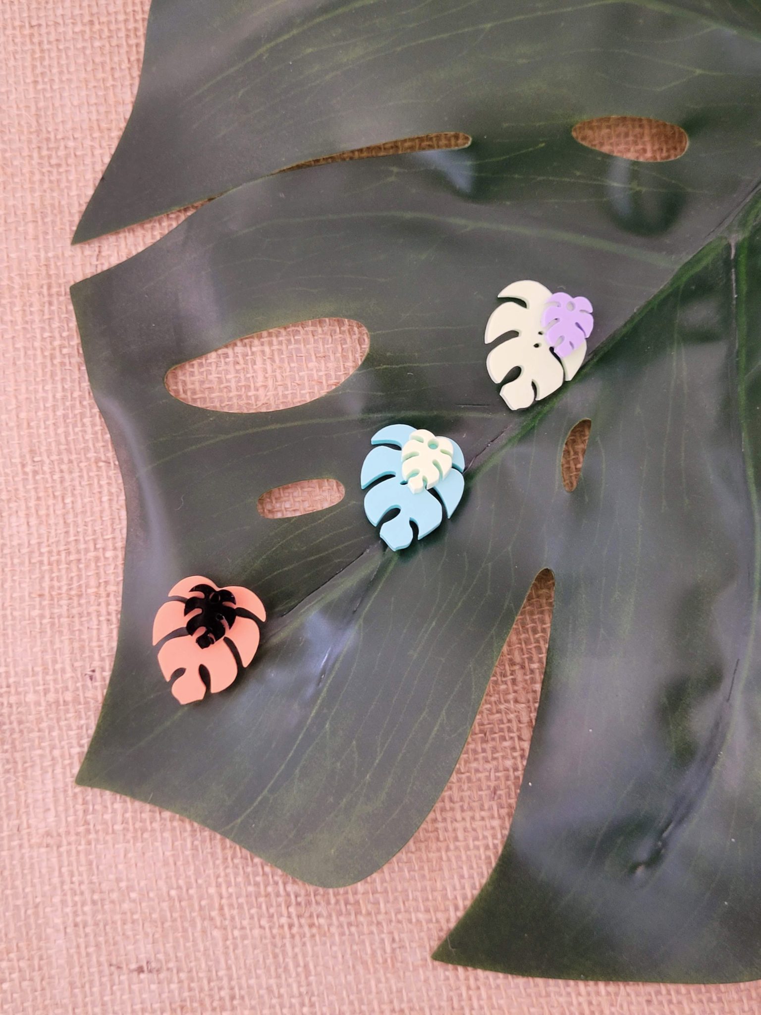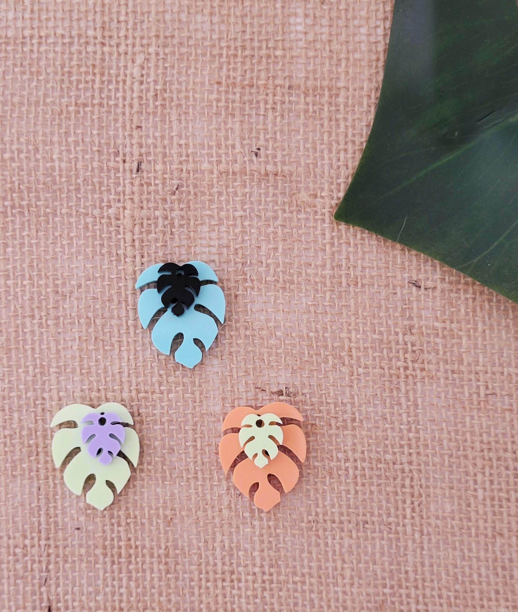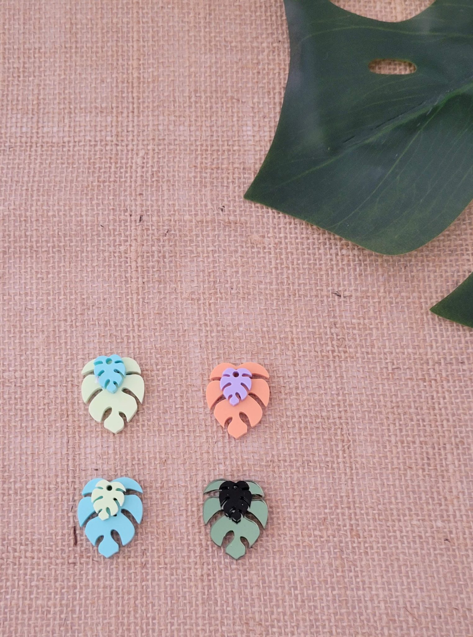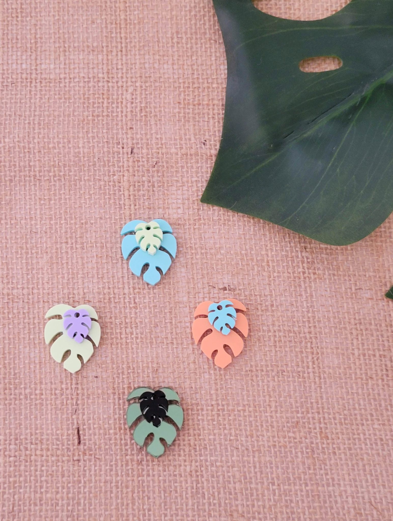 Para dar rienda suelta a tu vena más creativa! Todos vienen con las piezas de los tres colores que ves en la foto, para que acompañes la pieza de hoja de monstera con morado, blanco, rosa o la lleves sólo con el aro bañado en oro! También puedes mezclarlas todas y llevar colorines…