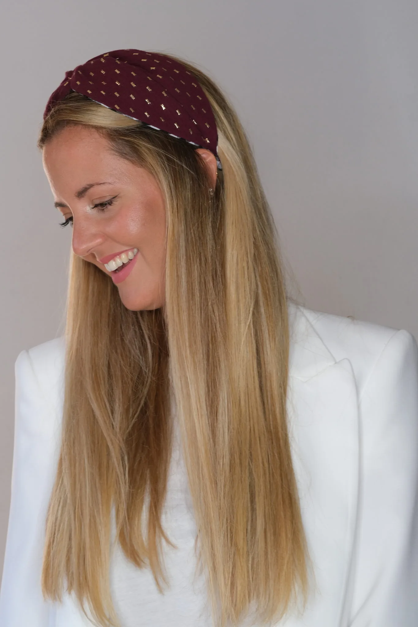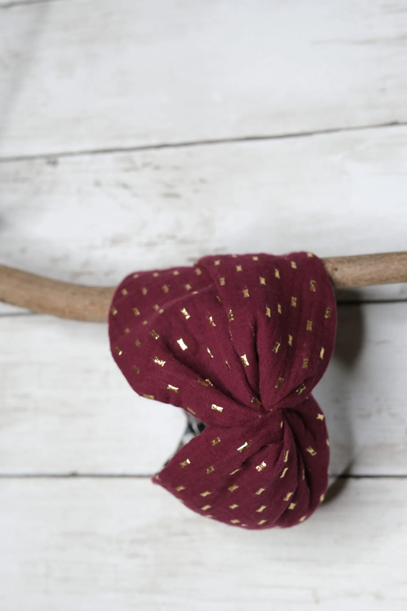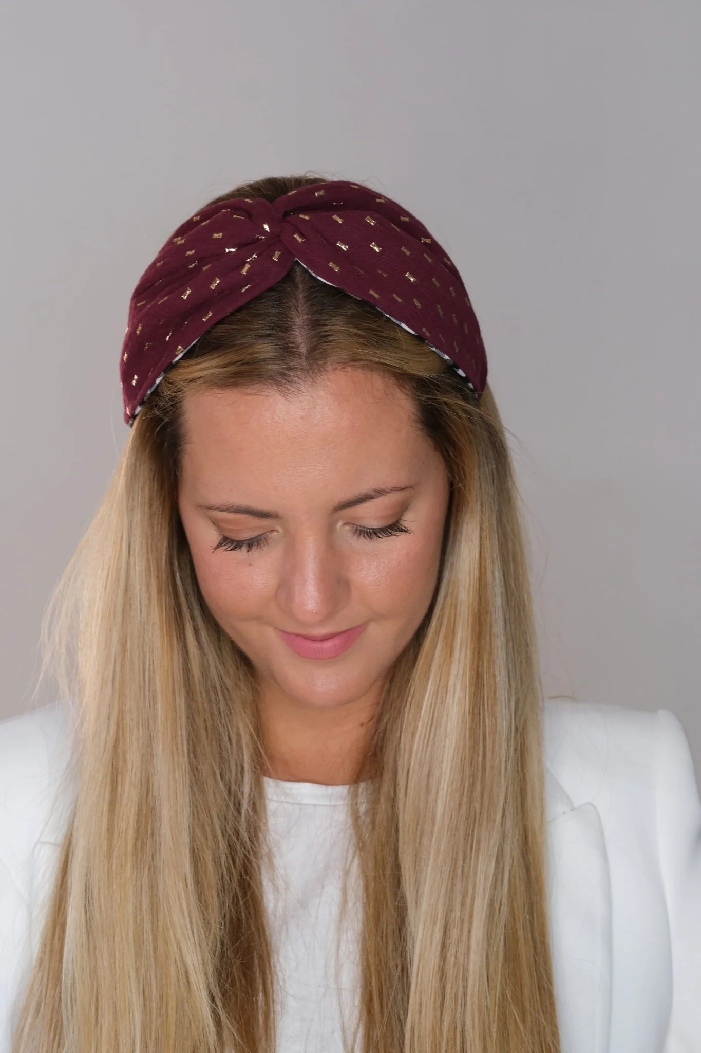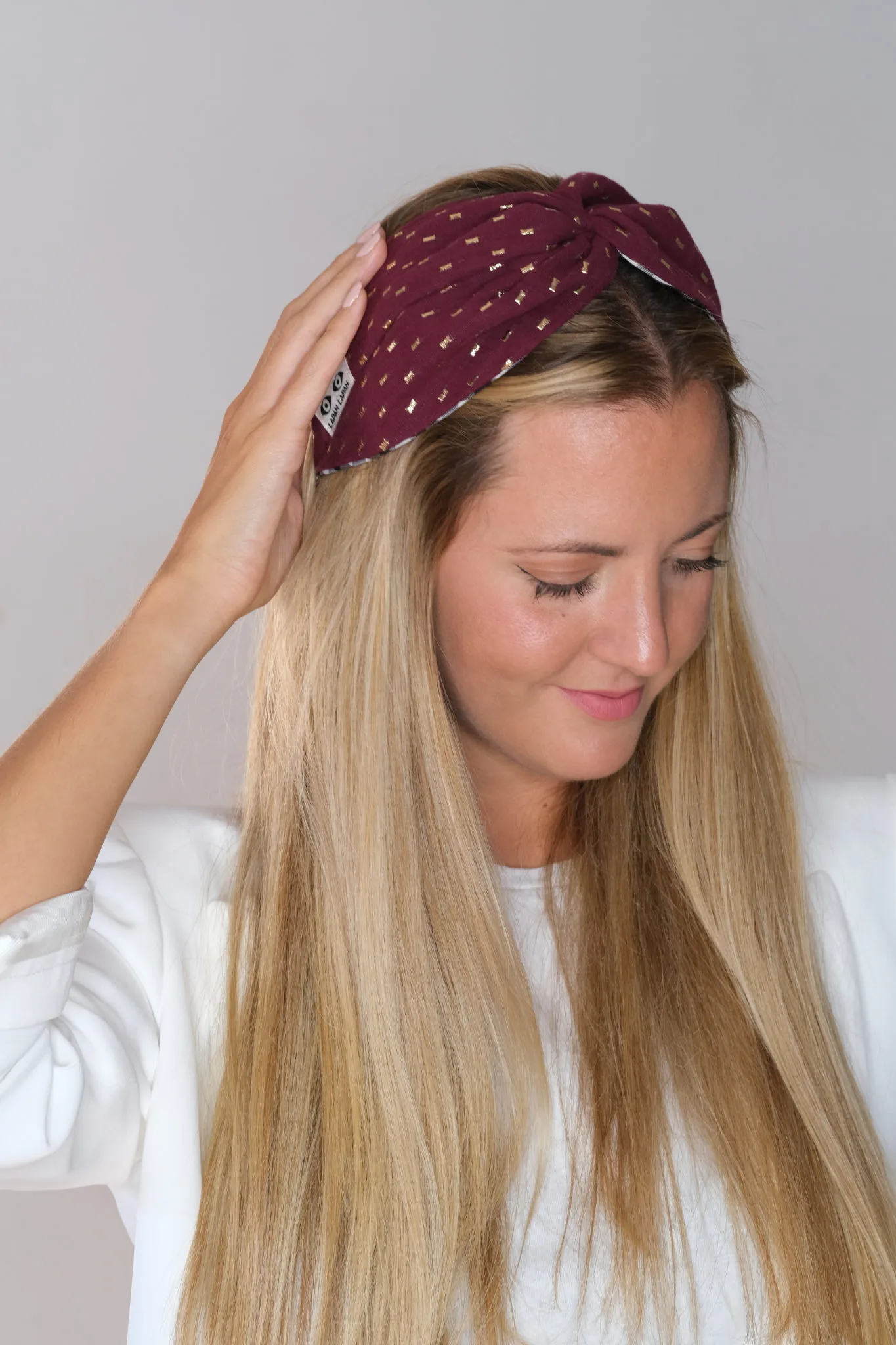 Sé el primero en valorar “Turbante mujer berenjena rayitas doradas”