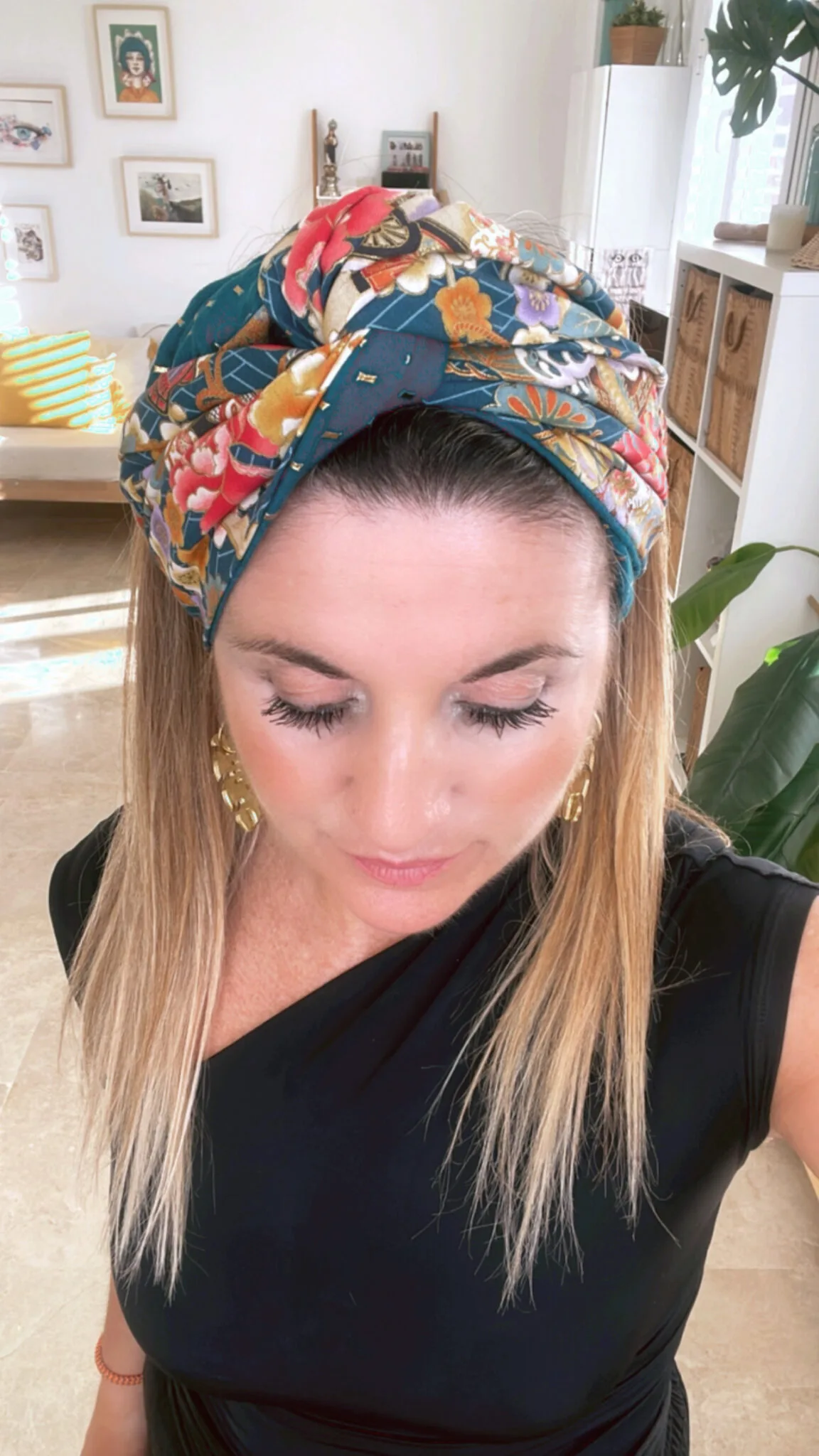 Turbante pañuelo tela japonesa peces y vichy mostaza