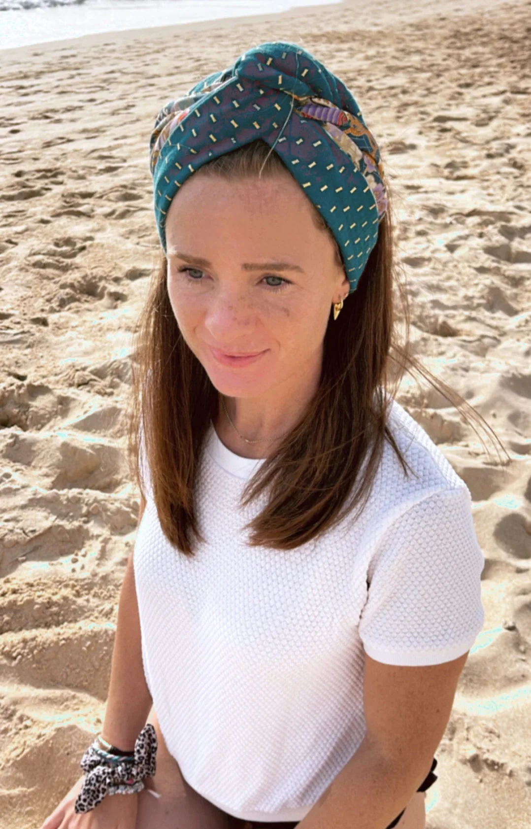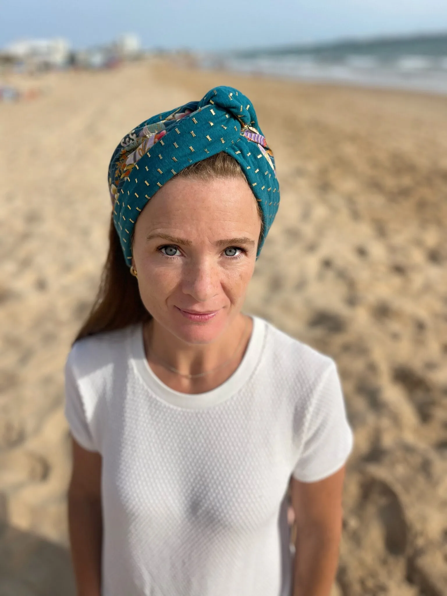 Turbante Pañuelo tela japonesa fondo blanco y verde agua puntos dorados