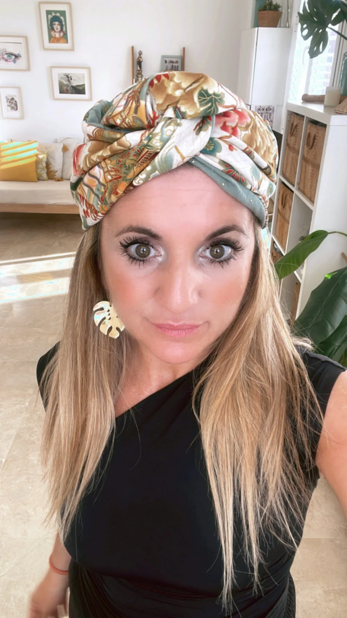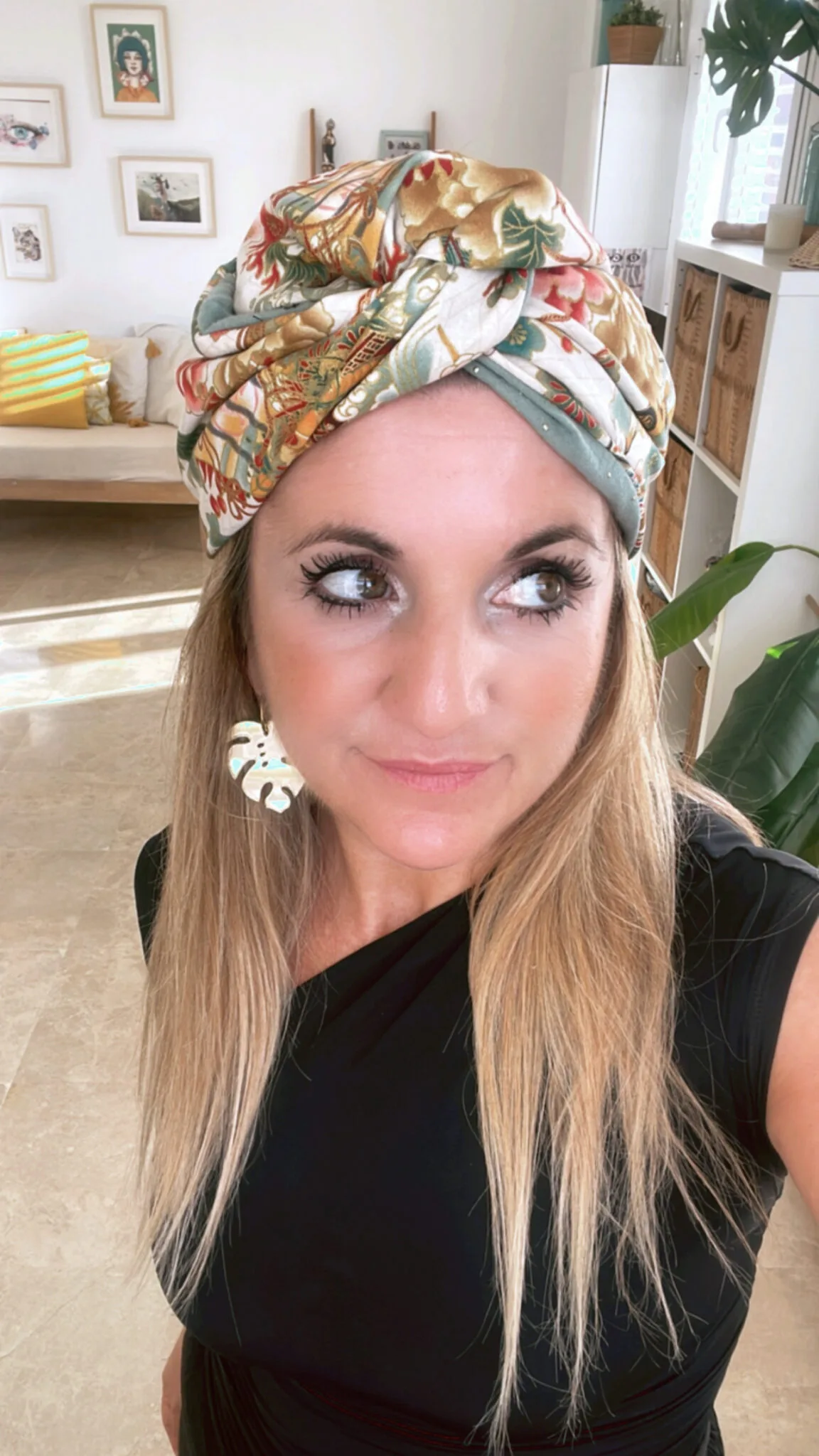 Puedes llevarlos cubriendo toda la cabeza o modo pañuelo (ver fotos de otros modelos). Son sencillos de poner, puedes ir a este vídeo donde verás dos propuestas de cómo llevarlos, pero feel free para ser creativa, porque el flexible y maleable alambre interior que lleva, se adaptará a TODO lo que quieras hacer .