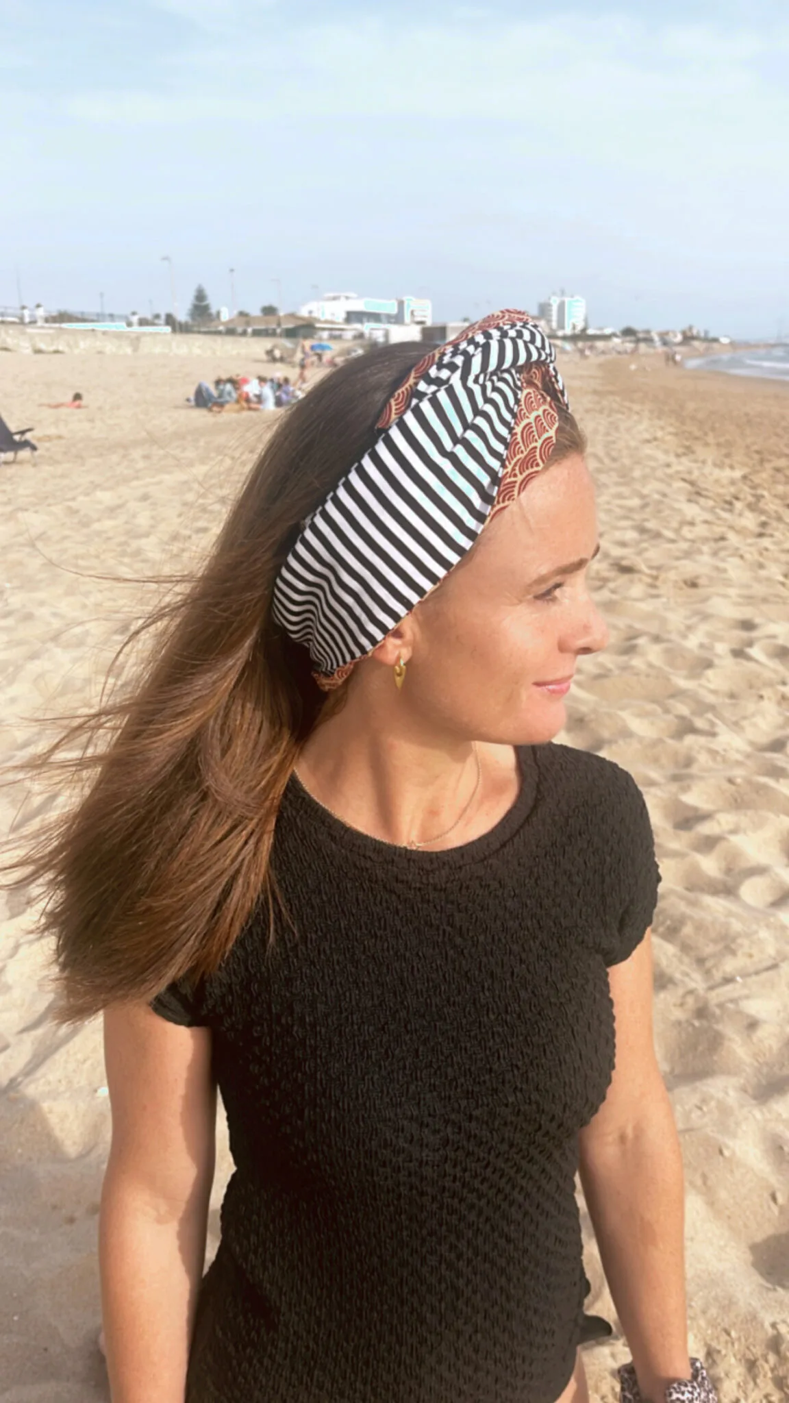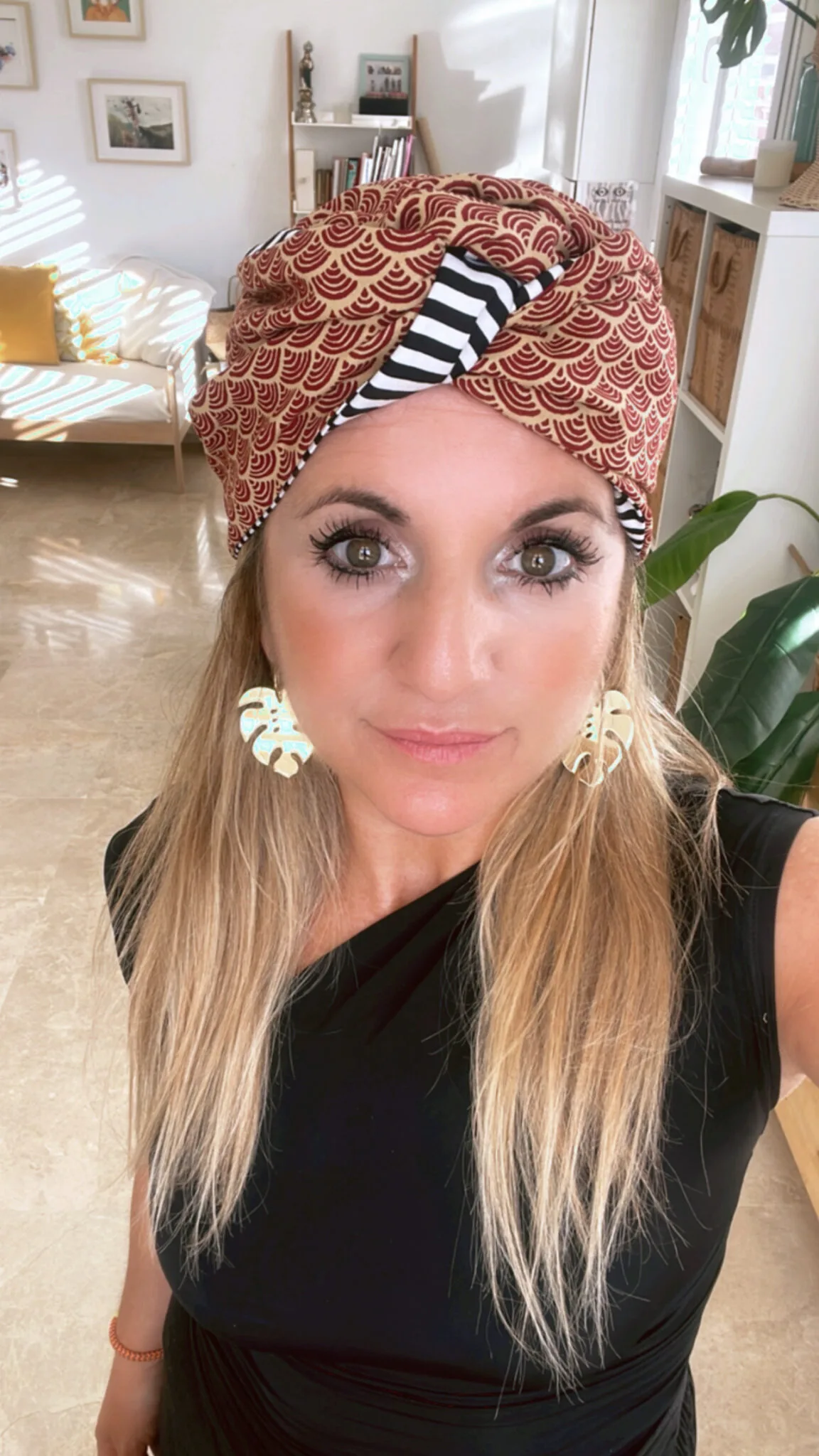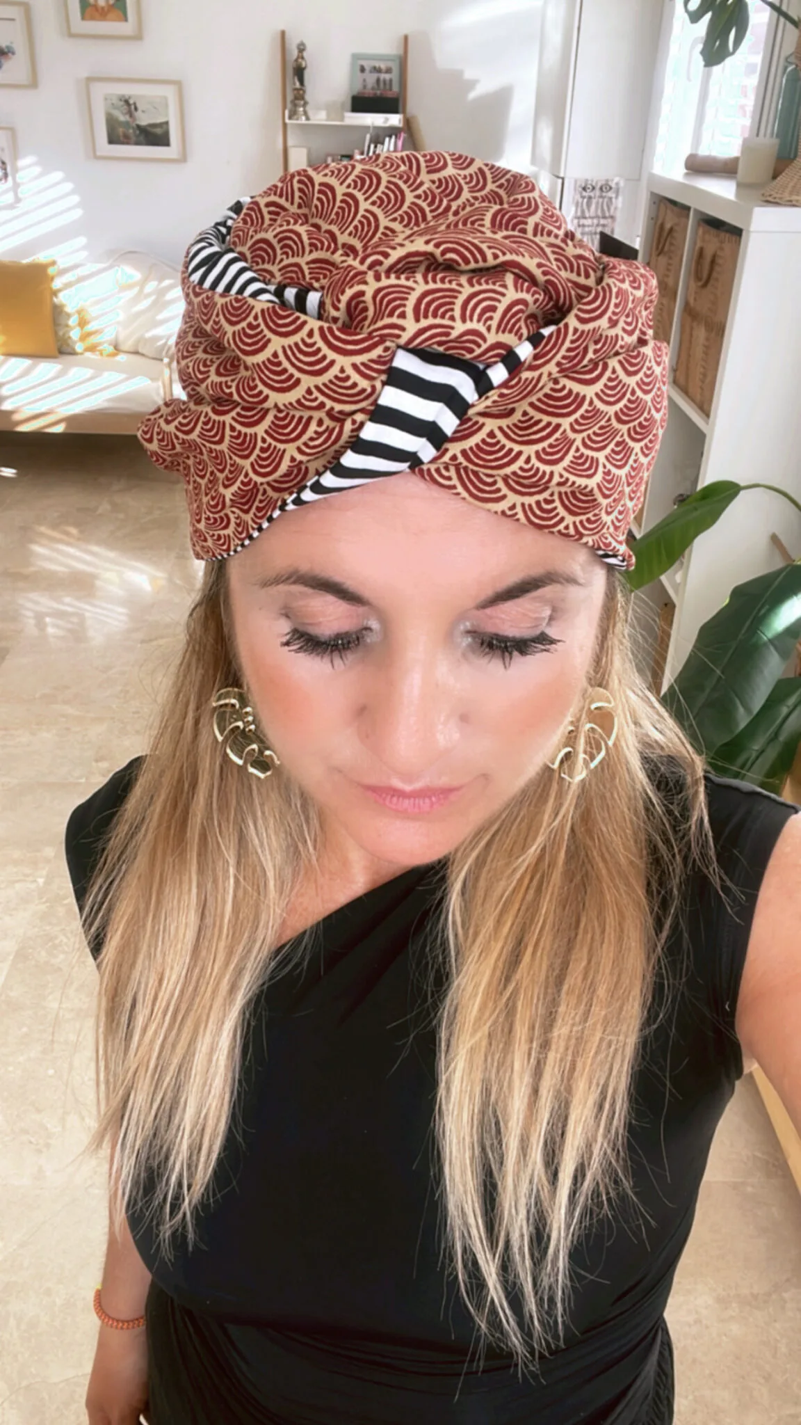 Puedes llevarlos cubriendo toda la cabeza o modo pañuelo (ver fotos de otros modelos). Son sencillos de poner, puedes ir a este vídeo donde verás dos propuestas de cómo llevarlos, pero feel free para ser creativa, porque el flexible y maleable alambre interior que lleva, se adaptará a TODO lo que quieras hacer .